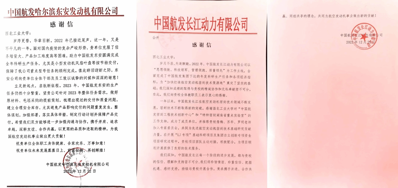 近日,中国航发哈尔滨东安发动机有限公司和中国航发长江动力有限公司分别给学校发来感谢信。在国内疫情的复杂严峻形势下,滕博会9885官网航空发动机高性能制造工信部重点实验室、密封与润滑等相关团队克服了诸多困难,按时完成了中国航发东安小型发动机风扇叶盘零部件研制任务、积极配合中国航发长江开展了国家重大专项及集团自主创新专项资金项目的实施,助力中国航发东安和中国航发长江圆满完成了全年科研生产任务。