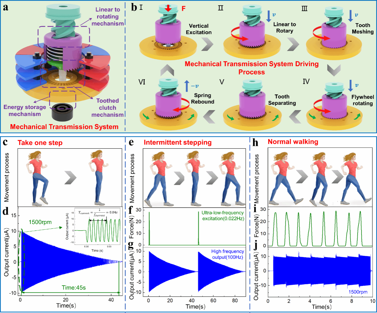 图2.(a)机械齿式离合器传动系统;(b)传动系统工作流程; (c-d)单次瞬时激励后输出电流波形; (e-g)超低频激励下输出电流波形; (h-j)正常行走时输出电流波形。