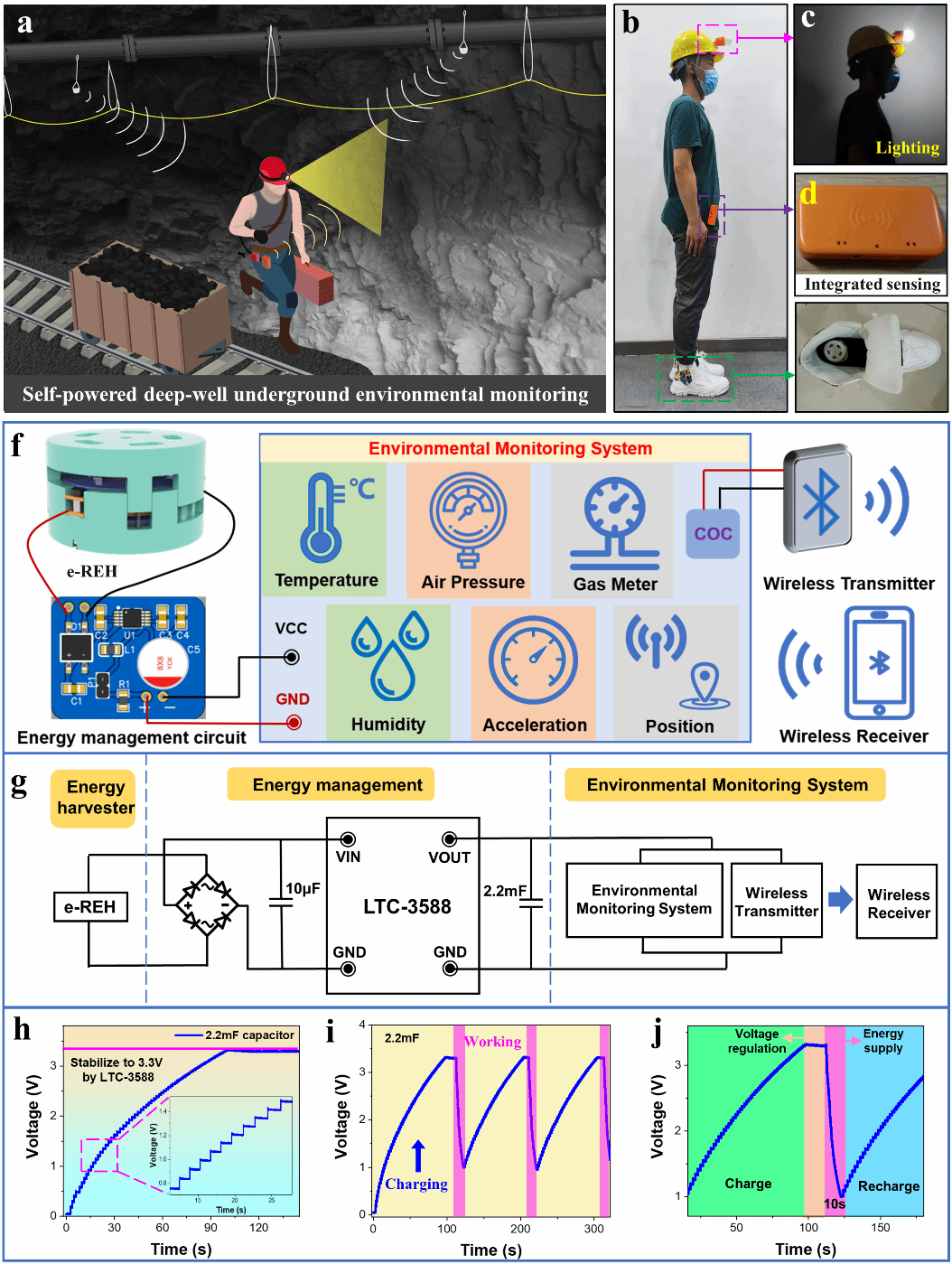 图 4. (a-d) 面向深地探测的自供能传感网络; (f) 自供能深地环境监测系统工作示意图; (g) 自供能深地环境监测电路图; (h-i)自驱动传感输出电压波形。