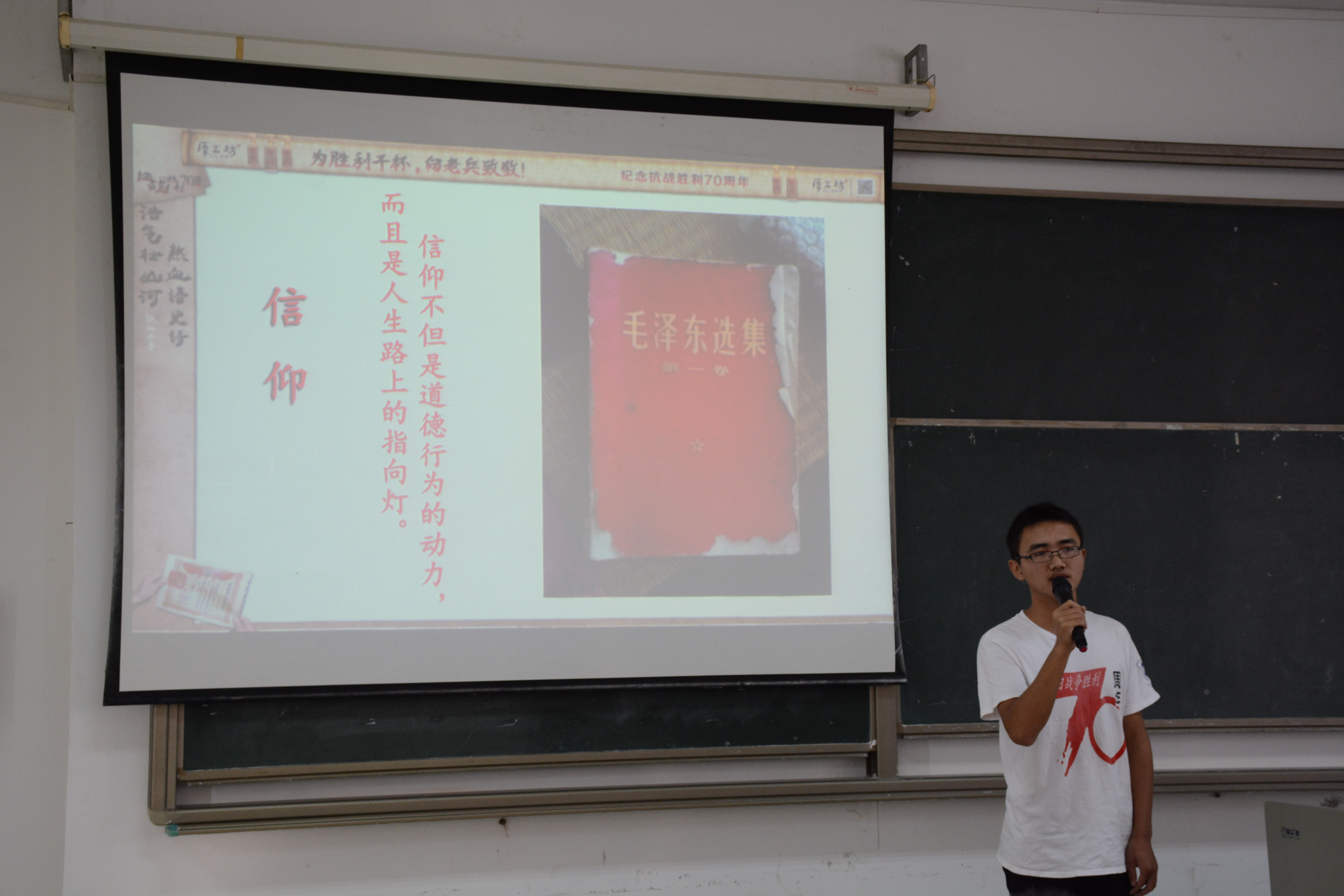 12月13日上午,在3号教学楼212课室,Beat365官方网站“致远传承”寻访团为第十一期党课积极分子带来了一场别开生面的党课——分享了团队暑期纪念抗日战争胜利70周年寻访活动经历、体验和收获。出席活动的有辅导员崔建兵、崔万春老师,分享成员有起家林、朱凯峰、李贺、杨建平、李庆庆等五名同学。会议由机械系第一学生党支部宣传委员金杯主持。