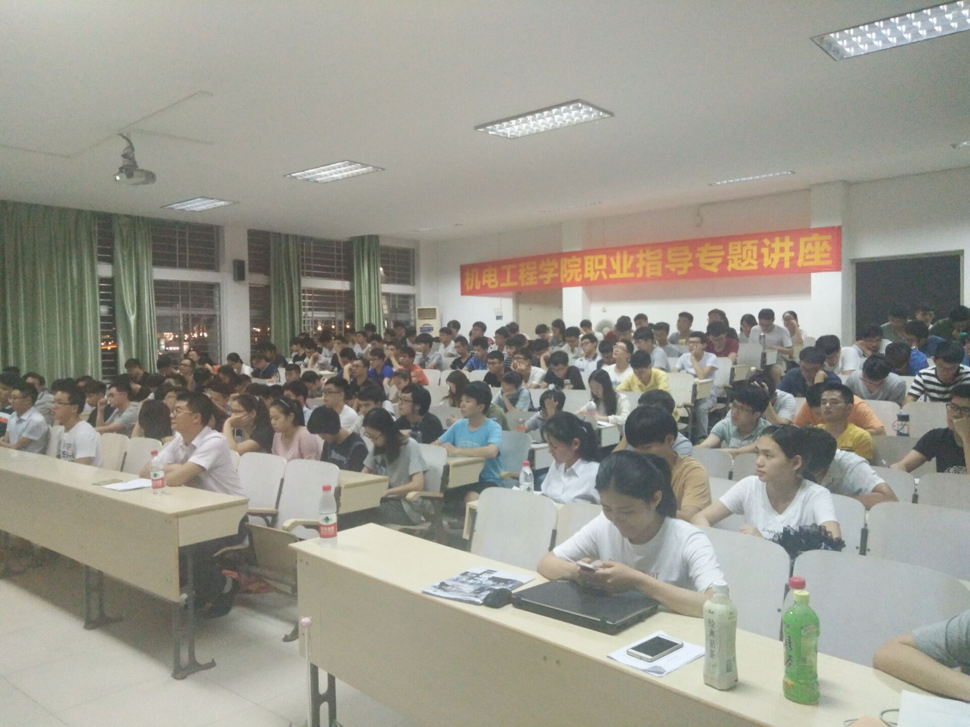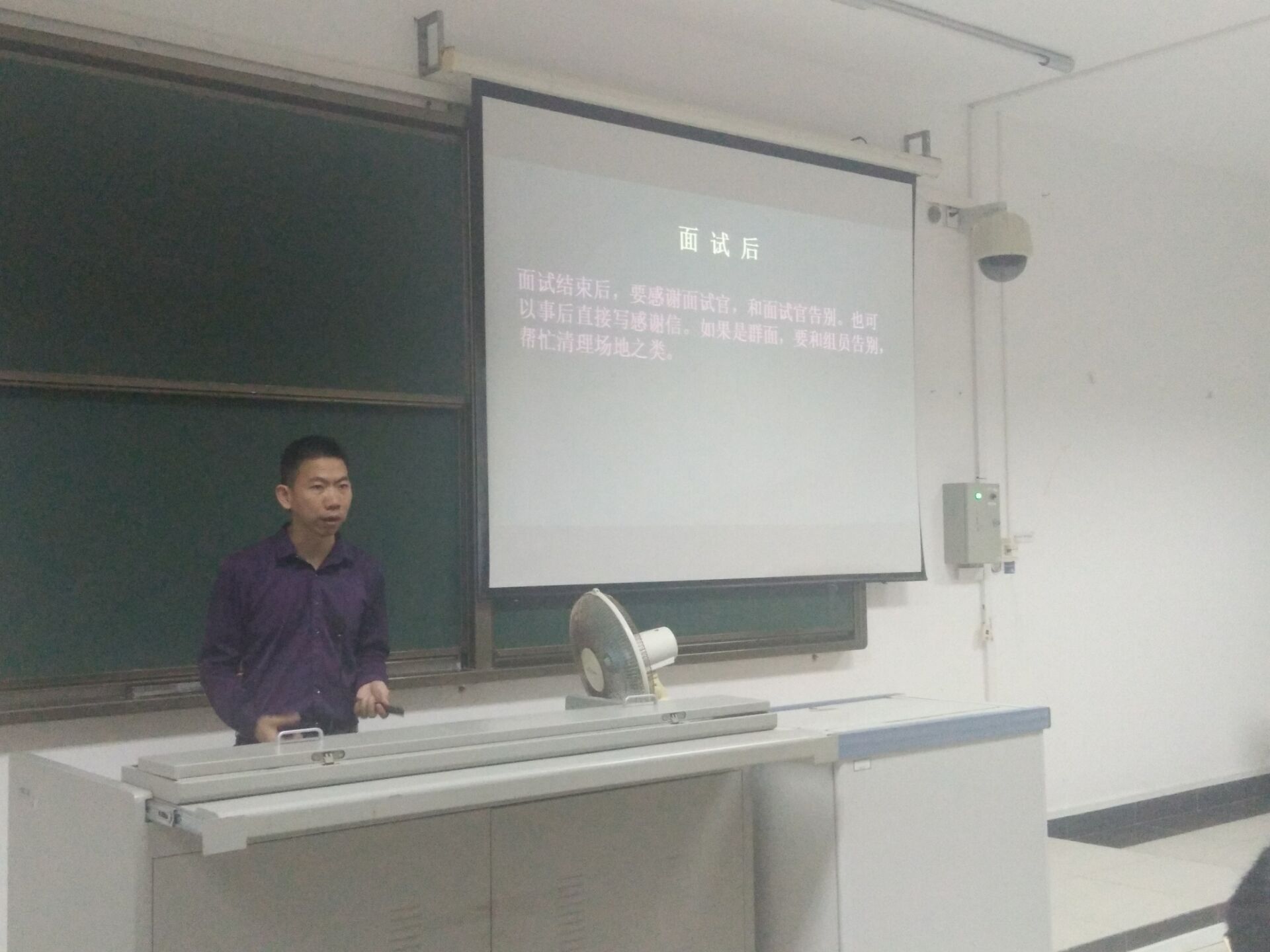 2017年5月9日,Beat365官方网站职业指导专题讲座在三教学楼309教室成功举办。出席活动的有星火教育招聘专员杨志浩老师、学工办主任崔建兵老师、年级辅导员傅悦老师,2014级及报名求职模拟面试的同学近200人参加。