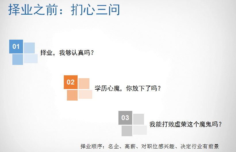 会议伊始,崔建兵老师就择业抛出了三个问题让同学们反思:一、择业,我够认真吗?二、学历心魔放得下吗?三、虚荣心魔能打败吗?在同学们认真思考过后,崔老师向同学们介绍了职场择业顺序:职位的专业性、职业兴趣、企业知名度、薪资高低。接着,崔老师详细介绍了六个选择职业的方法:选择“主角业务”,远离“寡妇职位”、选择“专业对口”的职位、不要轻易说“我不喜欢做技术,我想和人打交道”、充分了解职位、职业性格测试、择业终结法。随后,崔老师分享了如何选行业、如何选企业,建议毕业生应当选择有职业通道的公司,并结合个人性格、兴趣爱好和能力特点来选择国企或外企、大公司或小公司。崔老师还详细介绍了求职前应准备的材料:毕业就业推荐表、毕业生资源信息表、就业协议书、个人简历、成绩单、个人获奖证书以及备好五个行头。