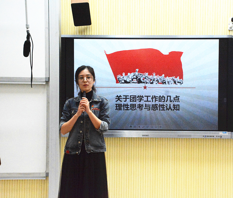 大会的第二项由袁周米琪老师进行授课,授课的开始阶段,袁周米琪老师就学生干部学习和工作的困惑做出了三个问题的汇总:为何要做一名学生干部?如何处理学习和工作之间的关系?为何进了组织之后感觉组织和想象中的不一样同时袁周米琪老师也提出了各级干部对自己的岗位应尽的职责:作为一名干事,就要将分派给自己的任务和自己去申请的任务做好,做出色;作为一名部长,要去努力思考,如何把分配的任务做得尽善尽美;作为主席,最应该具备的就是创造力。最后袁周米琪老师呼吁每一位干部,所有的机会都是自己去争取的,要敢于挑战,要积极主动,要勇敢面对接下来在工作和学习中的各种困难。