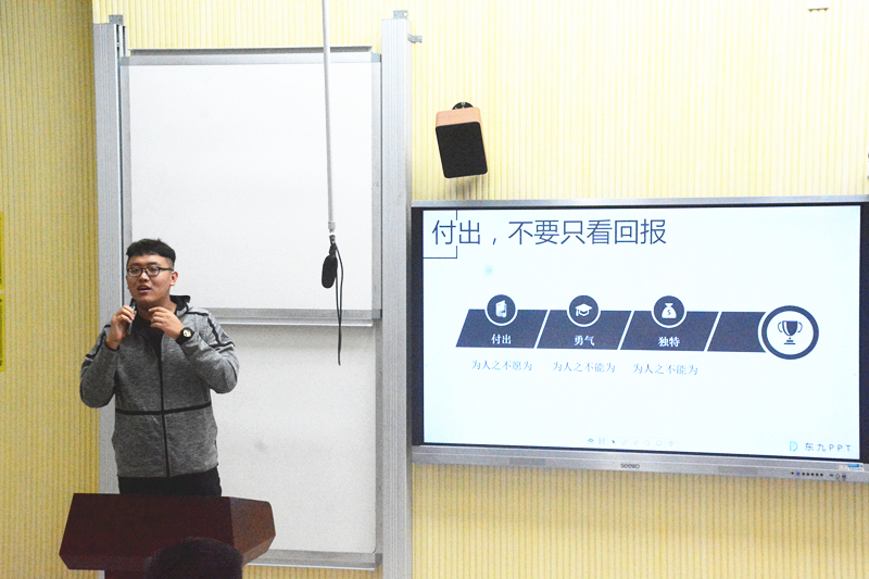 大会的第四项,由刘牧天学长进行经验分享,刘牧天学长分别从“为何出发,以何前行”;“规划,拥有一种思维”;“付出,不要只看回报”;“要有梦想,但要更懂现实”四个方面进行经验分享。并提出了“能力,坚持,视野,心态,经历,独特,团队”这七个方面对发展和成功的重要性。并且鼓励干事们“为人之所不愿为,为人之不能为,方能为人之所不能为”。在最后,刘牧天学长希望干事们要怀着感恩的心去经历身边的一切,怀着更大的自信去面对这个世界。