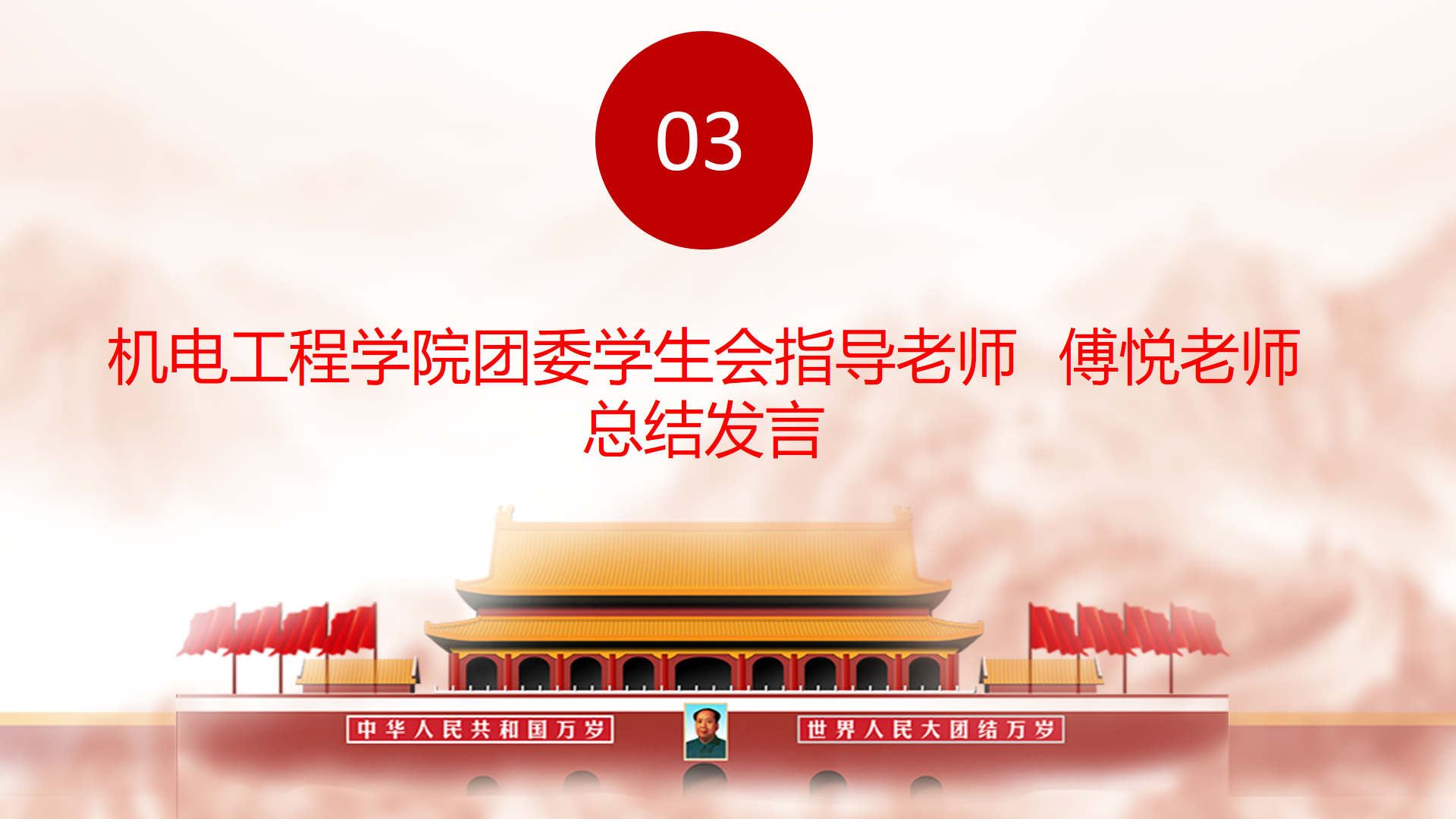 活动的最后,机电团委学生会的指导老师傅悦老师做了总结讲话。她表以抗日战争、朝鲜战争中为国捐躯的青年,以及上世纪60年代在戈壁滩为祖国研究两弹一星的党员青年为例,希望当代青年能够学习榜样的力量,能够在国家需要的时候站出来,成为国家的脊梁。她希望我们机电的学子们能够了解这个世界,认识中国所处的位置,在中华民族艰苦奋斗过程体会中华民族的伟大与美好。最后,傅悦老师祝愿Beat365官方网站的学生们五四青年节快乐,并表达了希望我们向上想好,为中华民族伟大复兴的中国梦而努力奋斗。