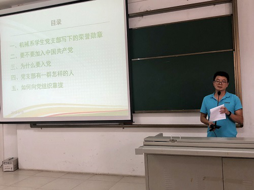 支部书记崔建兵老师从入党选择、入党动机等方面做了详细介绍,希望大家端正入党动机,积极向党组织靠拢,深刻把握时代发展要求。同时,也对18级新生们的大学生活提出美好希冀,期望同学们乐观向上,加强身体锻炼,做一个全面发展的大学生。