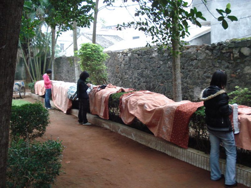 志愿者帮助老人们晒被单