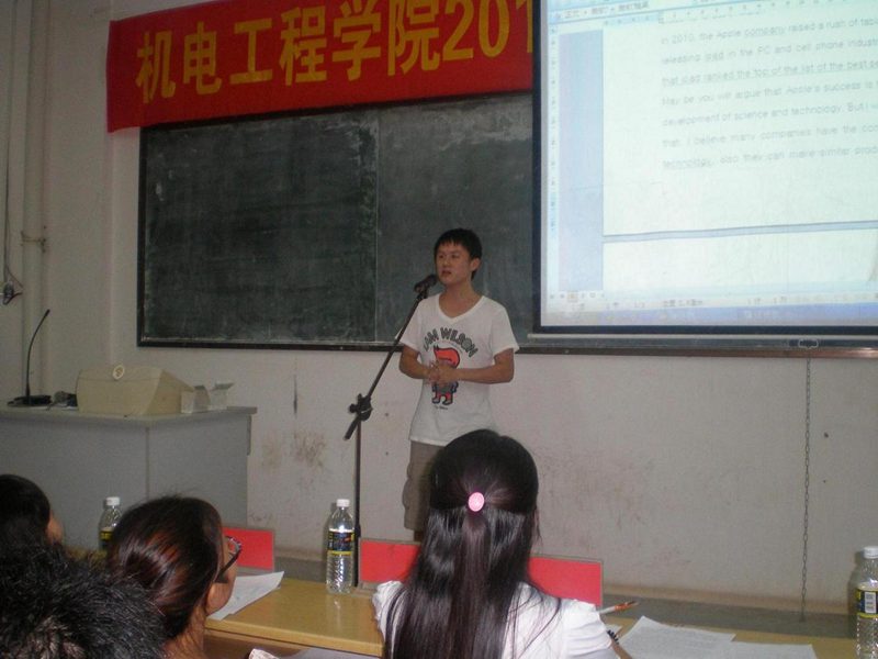 为了迎接2011年“外研社杯”全国英语演讲比赛,Beat365官网在9月8日(星期四)在3302课室举行院内选拔。出席此次英语演讲比赛的嘉宾有崔建兵、姚广龙老师,担当评委的有应用科技学院英语老师王菲、金晓霞,以及全国大学生英语竞赛(NECCS)获奖者马鑫。此次演讲的题目是:A Word That Has Changed the World。比赛选手由各班级推荐,共15名参赛选手,到场观众有近160名。