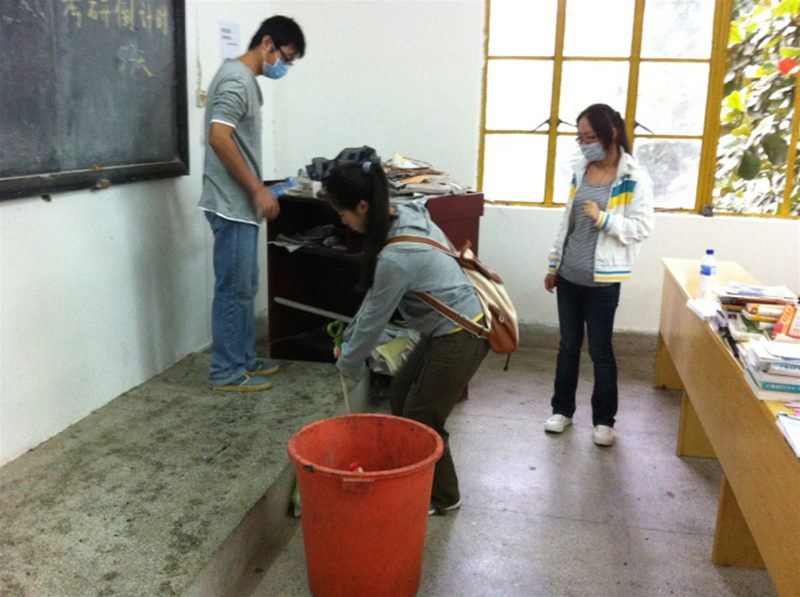 为了不打扰考研学生的学习,09车辆2班全体同学在班委的组织,早上7:00就下来到成教楼,对自习室垃圾的清理和喷撒消毒液。在另一项张贴标语的公益活动则选择在晚上七点钟,标语内容积极向上,催人奋进,如:天行健,君子以自强不息;地势坤,君子以厚德载物。