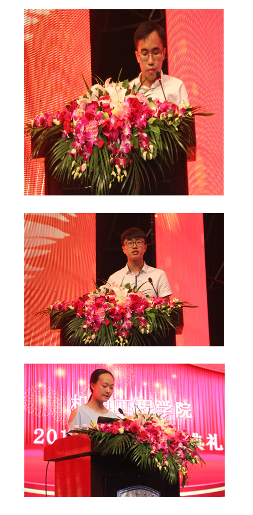 学院学生会主席胡鑫宇作为老生代表发言,以学长的身份为新生在角色转换、生活适应、自我管理、个人规划等方面给出了自己的建议。王卓代表新生发言,她希望和同学们放下对过去浓浓的不舍,勇敢而独立地安排好自己的新生活,在大学发展个性,发展自我。