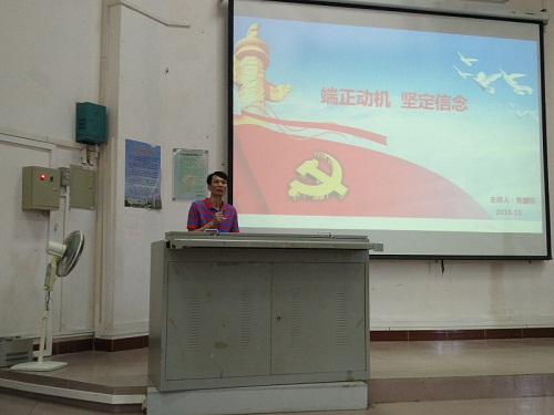 2016年11月6号上午,Beat365官方网站分党校第二期党员发展对象培训班第五讲由学院党委黄国标书记讲授《端正动机,坚定信念》,培训班班长尹凡主持本次培训学习。参加本次党课的有本期发展对象和积极分子。