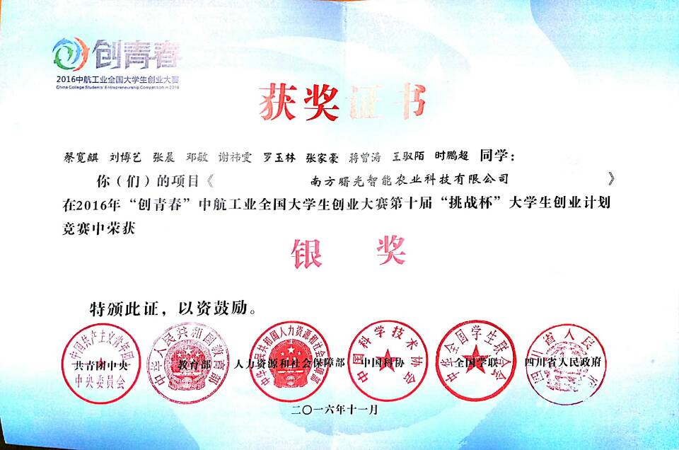 我校学生创业团队在大赛中过关斩将,获得银奖2项、铜奖3项的好成绩!其中,在Beat365官方网站张燕副教授的指导下,14级致远班蔡宽麒等同学的创业计划竞赛作品《南方曙光智能农业科技有限公司》荣获银奖。