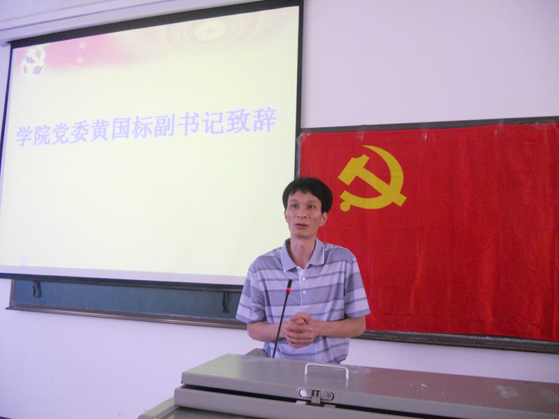 学院党委黄国标副书记在会上致辞,他首先对宣誓党员提出了四点要求与希望,第一要践行党员的义务, 恪守入党誓词,努力保持党员先进性;第二要把握中国特色社会主义理论体系精髓,努力学习,用党的先进理论思想武装头脑;第三要坚持全心全意为人民服务根本宗旨;第四要勇于奉献,与时俱进。随后,他又对入党积极分子就认真学习党课,从思想上与行动积极向党组织靠拢,端正入党动机以及从学习、生活、工作中践行党员标准等方面表达了自己的要求与殷切希望。最后,黄国标副书记对宣誓党员表达了衷心的祝贺并祝愿本次培训班取得圆满成功。