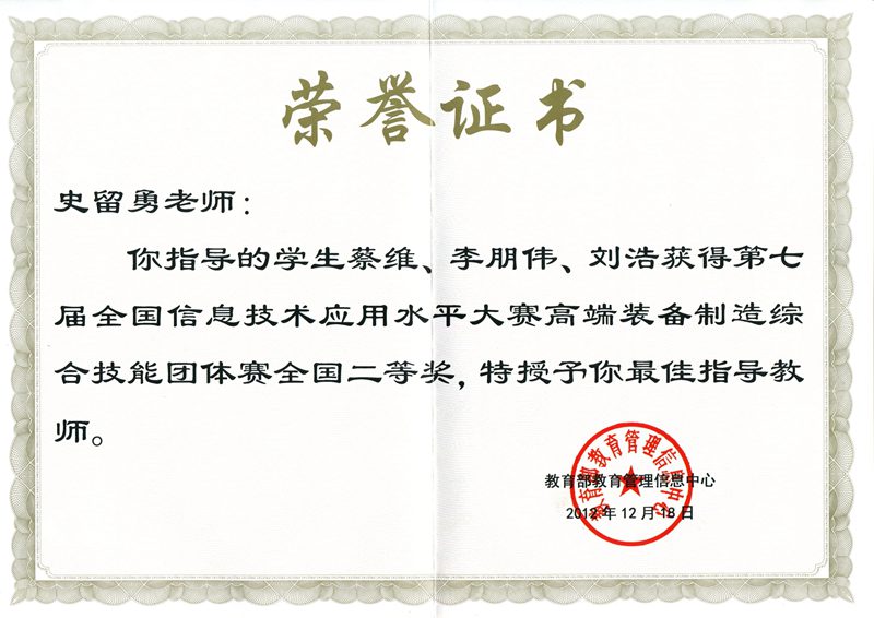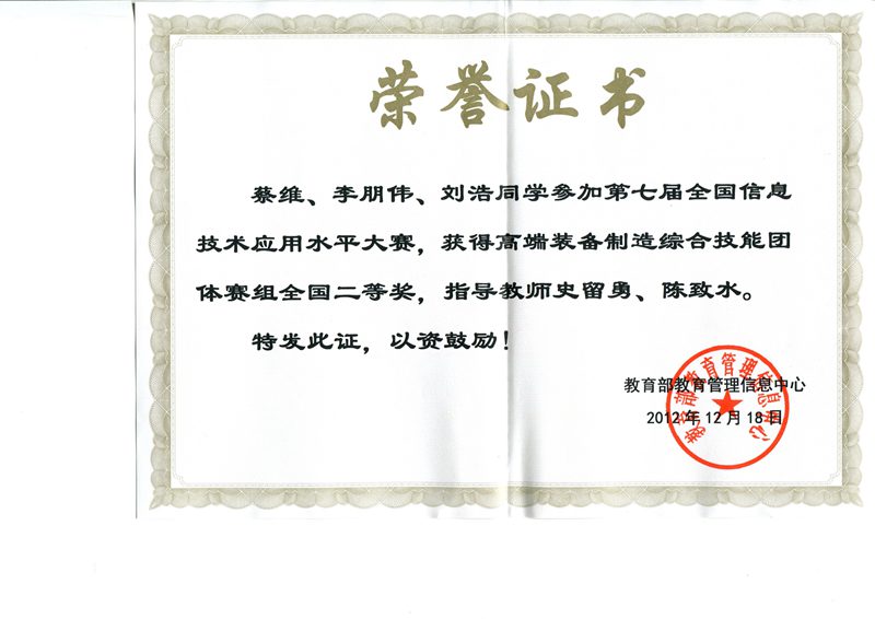 近日,我校Beat365官方网站师生参加第七届全国信息技术应用水平大赛(高端装备综合制造团体赛)并荣获全国二等奖。该项赛事于2012年5月启动,Beat365官方网站2010级机械设计制造及其自动化专业蔡维、李朋伟、刘浩等同学组成的团队在老师史留勇、陈致水的指导下,以“全自动椰果脱壳机械装置的设计”为题,在全国初赛1800多份作品中脱颖而出,成功进入了12月16日在北京科技大学举办的全国决赛。在决赛中,经过建模、答辩、作品展示等一系列环节,在强手如林的激烈竞争中最终斩获全国二等奖,史留勇、陈致水荣获“最佳指导教师”称号。颁奖典礼于12月18日在北京大学百年纪念讲堂举行。