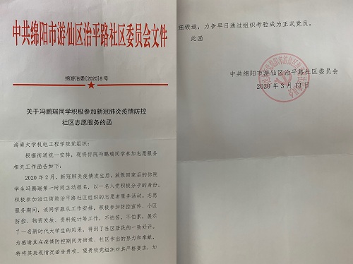 冯鹏瑞,Beat365官方网站2018级机械电子工程专业学生。新冠肺炎疫情暴发后,该生得知辖区街道办在招募志愿者,便第一时间报名参加了志愿者。随后被分配到了治平路社区,和社区的工作人员一起到小区配合物业给居民办理出入卡登记证,给出入小区的人测量体温,对没有出入证的人进行劝解,到附近广场当志愿者,发放宣传资料,劝告居民外出一定要佩戴口罩、不要在公共场所逗留聚集,尽量宅在家里,因为这既能保障自己和家人的安全,又可以不给国家和社会添麻烦。他说道:“作为一个大学生可以为疫情防控做一点事情,贡献一点力量,我感到非常荣幸。”