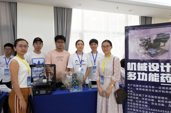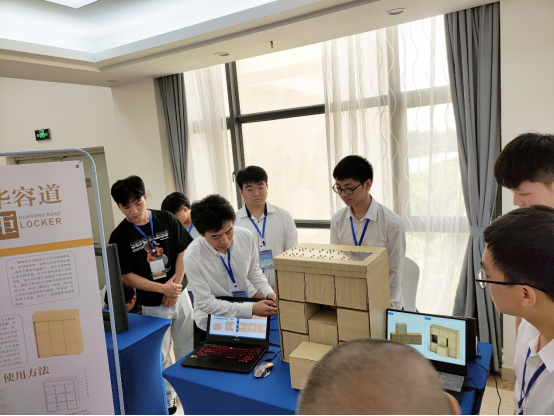 本次比赛分现场问辩和答辩两个环节,现场问辩环节中,7位评委一起进行问辩,参赛学生展示参赛作品的功能,介绍功能原理和亮点;答辩环节中,参赛学生进行PPT答辩,评委提问并仔细检查说明书和图纸。