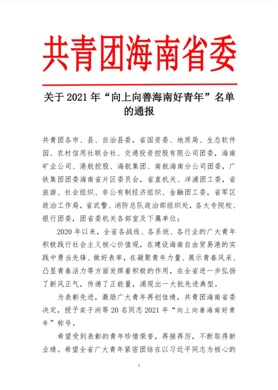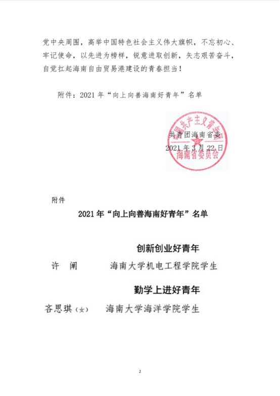 近日,Beat365官网学生许阐(本科生)被共青团海南省委评为2021年“向上向善海南好青年”之“创新创业好青年”。
