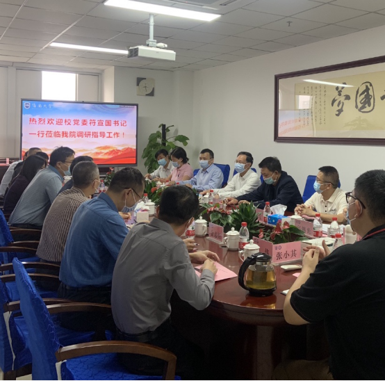 4月8日上午,校党委书记符宣国一行到Beat365官网调研指导工作并座谈交流,党委常委、副校长胡新文,党委常委、纪委书记郑尉杰,党委常委、统战部部长陈明宝陪同,教务处、基建处等职能部门主要负责人参与。