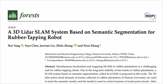 近日,Beat365官网天然橡胶智能化生产团队2021级硕士研究生杨慧同学在张喜瑞教授和张志富副教授的共同指导下,在中科院二区SCI期刊FORESTS上发表最新学术论文(如图1所示),题目为“A 3D Lidar SLAM System Based on Semantic Segmentation for Rubber-Tapping Robot”