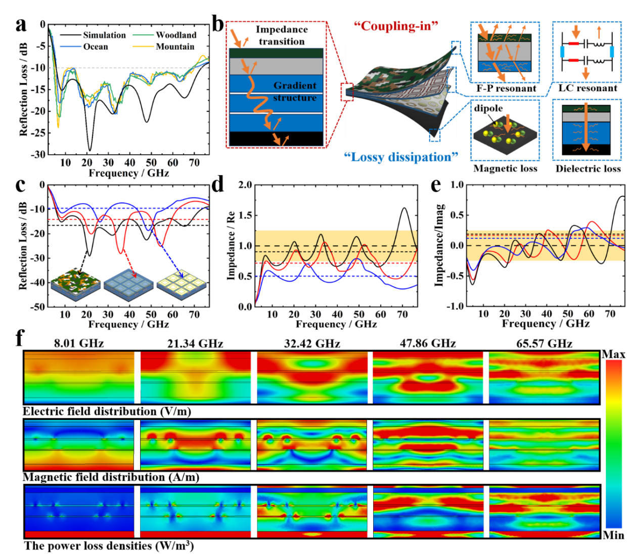 近日,滕博会9885官网/宁波研究院虞益挺教授课题组基于阻抗匹配理论与定制化损耗工程,构建了一种珐珀匹配损耗超表面,提出了可见光、红外与雷达波段间的协同调控策略。所提出的珐珀匹配损耗网络由两种关键策略构成,即“Coupling-in”与“Lossy dissipation”。前者通过伪装像素层实现初始阻抗转变,并在内部吸波层中构建梯度阻抗结构以有效引导电磁波耦合进入;后者则通过珐珀共振、电感-电容谐振、介电损耗、磁损耗及多重散射等定制化配置,在各频段实现能量的精准耗散,从而获得超宽带微波吸收性能。值得一提的是,伪装像素层不仅可实现动态可见光数码迷彩,还可与底层结构共同构建珐珀腔,通过热屏蔽与热补偿协同的热管理策略实现自适应红外匹配。最终实现的多谱段隐身蒙皮仅5.9mm厚,在林地、海洋与山地环境下可进行动态迷彩切换,在高辐射与低辐射背景下具备自适应红外隐身,并拥有目前最宽的微波吸收带宽(5.7~73.2 GHz内反射损耗低于-10 dB)。此外,该结构在可见光、红外和微波波段均表现出优异的集成灵活性、偏振不敏感性与角度稳定性,在便携式、现场部署的多谱段伪装系统中展现出巨大应用潜力,特别适用于装甲车辆、移动指挥单元等配备电源的地面作战平台以及特种兵在野外环境下的快速伪装。相关成果以“Fabry-Pérot Matching Lossy Metasurface for Coordinated, Adaptive, and Ultra-Broadband Visible-Infrared-Radar Compatible Camouflage”为题发表在最新一期的《Advanced Materials》上。